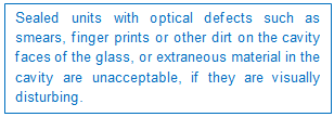 The obtrusiveness of blemishes is judged by looking through the glass, not at it, under natural light. It must be understood that the glass used in sealed units is a processed glass, and as a consequence, blemishes are to be expected.